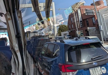 友人は改札口で待っていてくれた。万博以来の再会に、言葉よりも笑顔が先に出る。コミュニティ行きのバスまで少し時間があったので、駅前の喫茶店でコーヒーを飲みながら近況を語り合った。やがて時間になり、コミュニティの送迎バスに乗り込んだ。