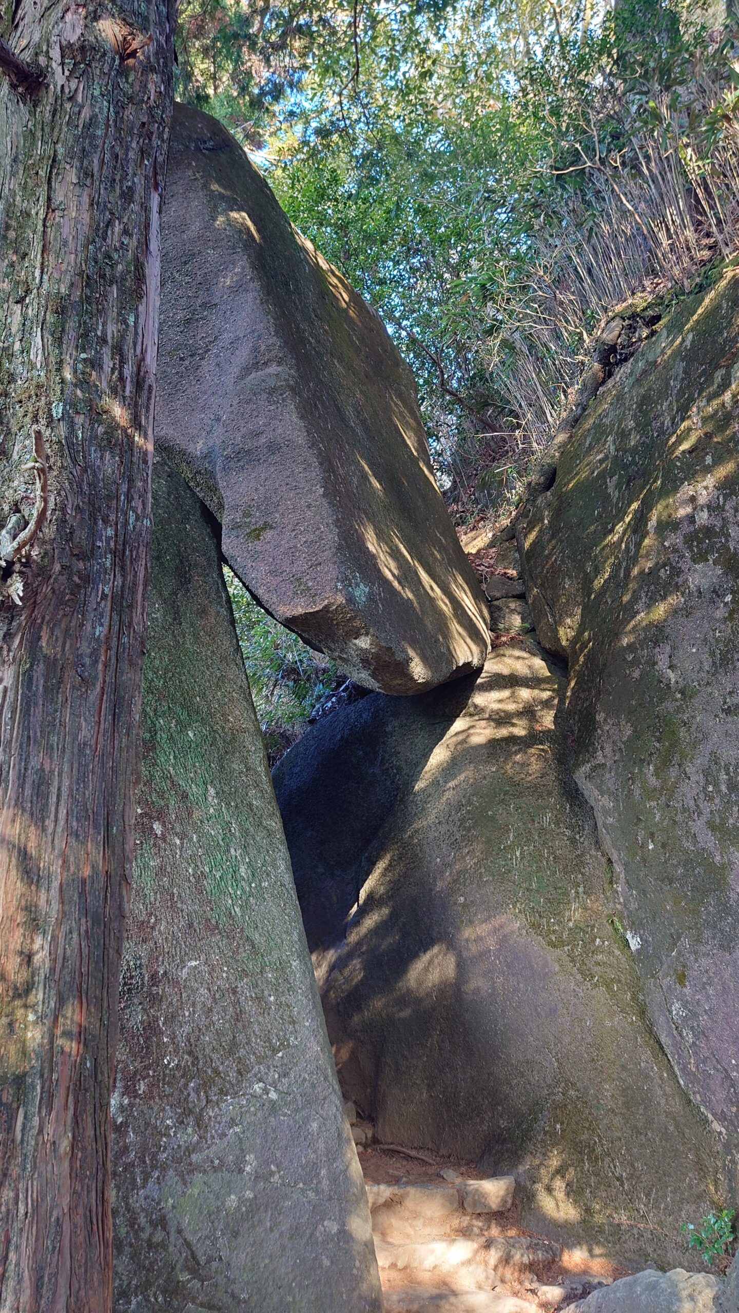 頭上の岩が今にも落ちそうで、弁慶も七回戻ってから下を通った奇岩。らしい。